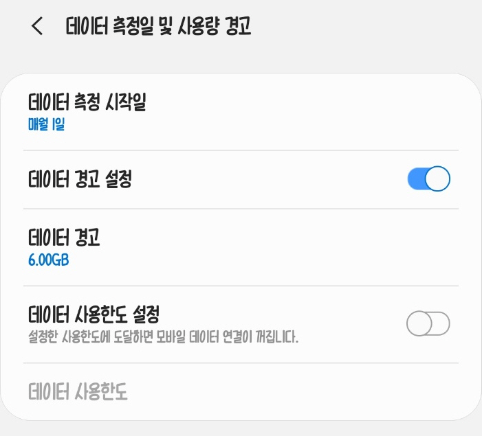 데이터 무제한이 아니라면 먼저 데이터 경고 설정과 데이터 사용한도 설정을 활성화 시켜주세요. 데이터 측정 시작일은 언제부터 데이터 사용 측정 할 것인지 나타내는거여서, 매월 1일로 설정하시면 됩니다.